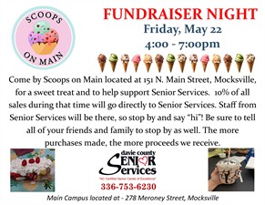 Come by Scoops on Main located at 151 N. Main Street, Mocksville, for a sweet treat and to help support Senior Services. 10% of all sales during that time will go directly to Senior Services. Staff from Senior Services will be there, so stop by and say “hi”! Be sure to tell all of your friends and family to stop by as well. The more purchases made, the more proceeds we receive.
